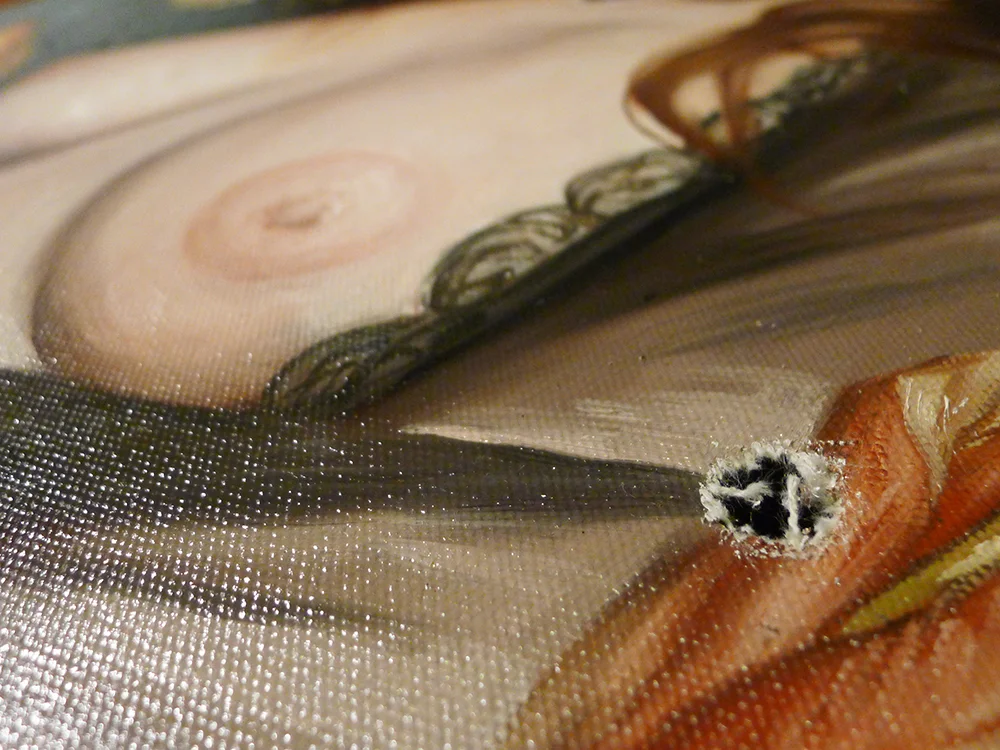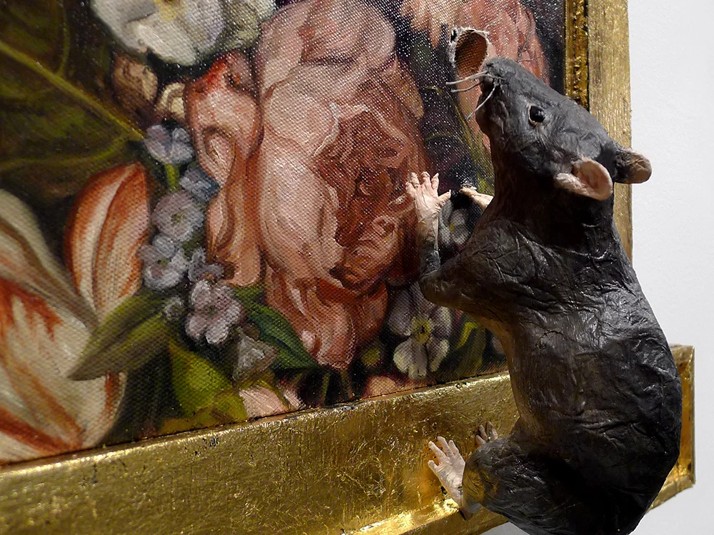 Make My Flesh Yours. 22"x30" (excluding length of rat’s tail), oil on canvas, paper, wire, glue, and acrylic, metal leaf on styrofoam.