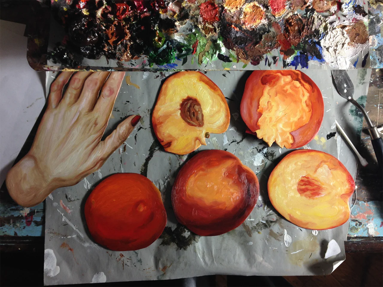 More items for a lusty feast + one of two hands for a little diptych. Oil on birch plywood. March 18, 2015